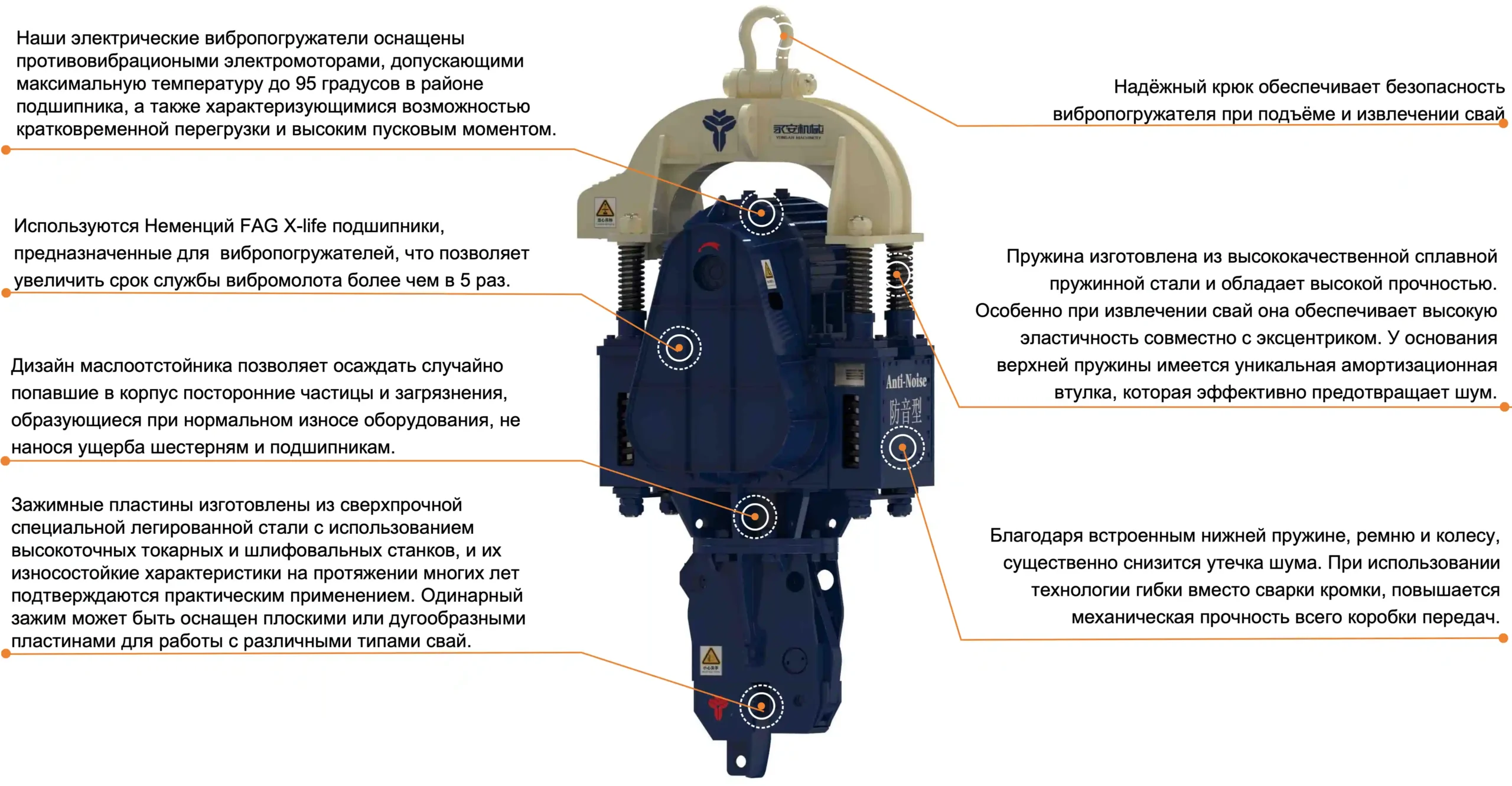 Наши электрические вибропогружатели оснащены противовибрациоными электромоторами, допускающими максимальную температуру до 95 градусов в районе подшипника, а также характеризующимися возможностью кратковременной перегрузки и высоким пусковым моментом.