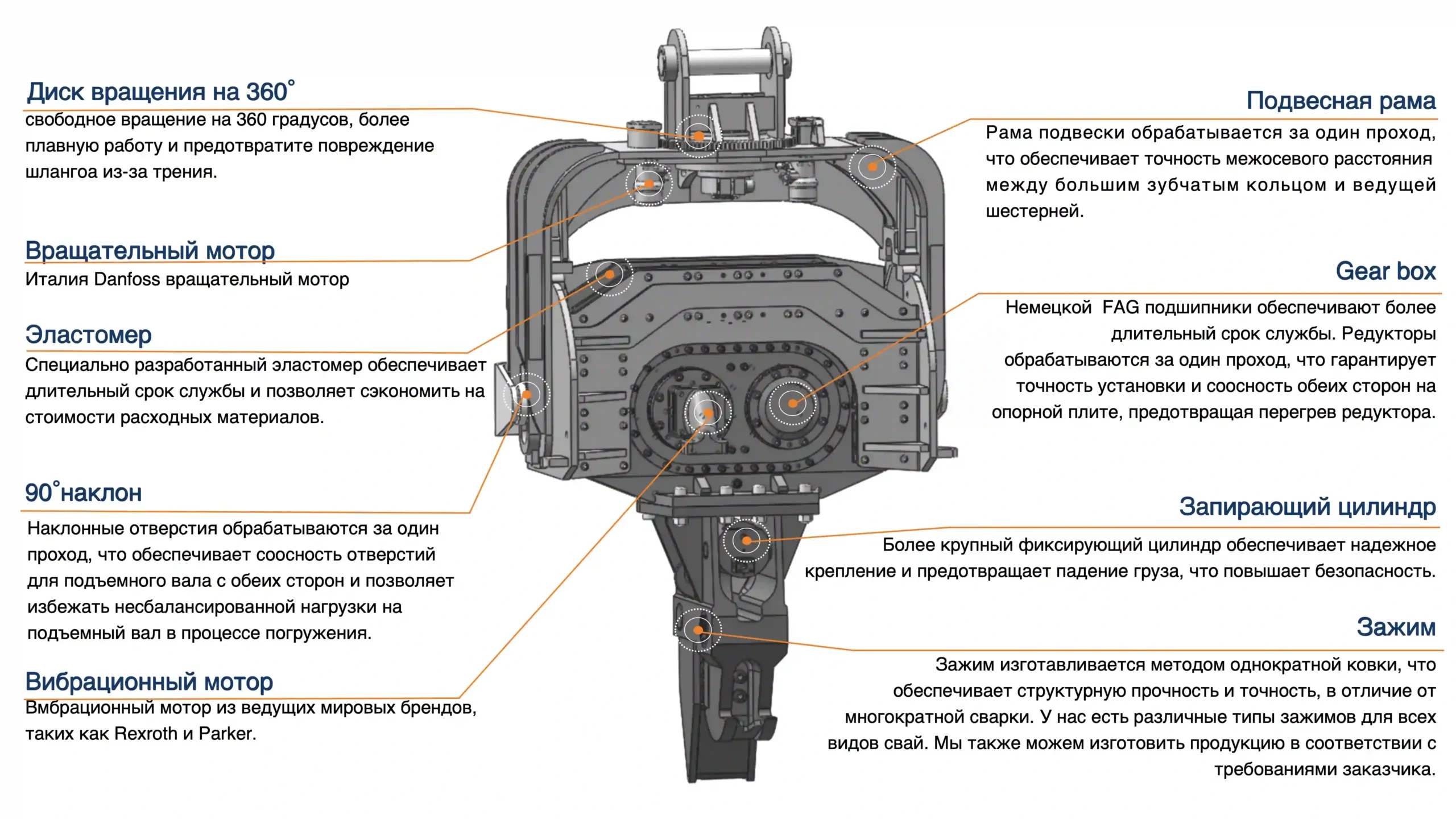 Полное гидравлическое управление, интегрированная система управления, каждое действие независимое. Вращение на 180 °/360°, наклон на 90 °, легко захватать сваи.
