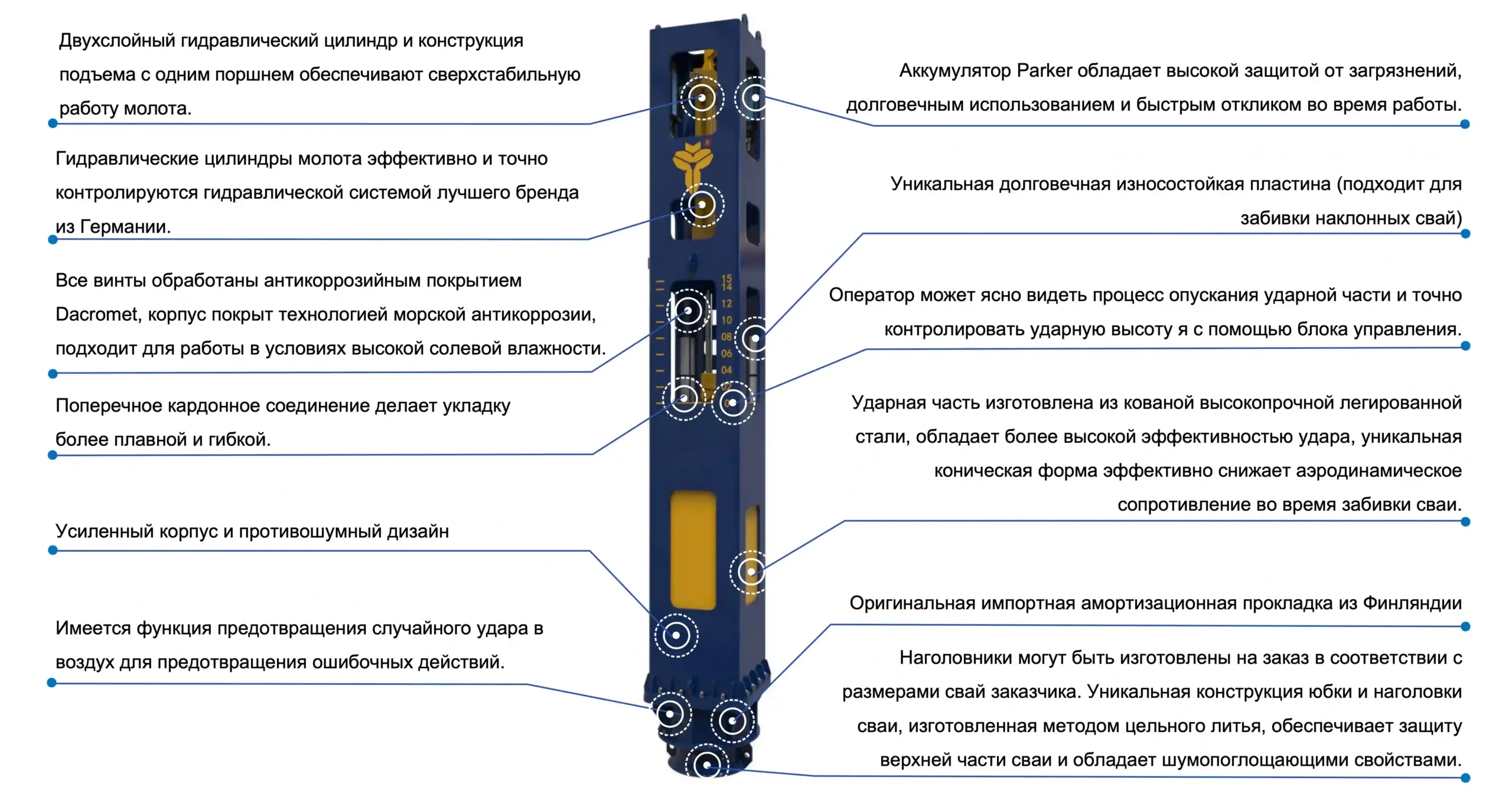 Ударная часть изготовлена из кованой высокопрочной легированной стали, обладает более высокой эффективностью удара, уникальная коническая форма эффективно снижает аэродинамическое сопротивление во время забивки сваи.
