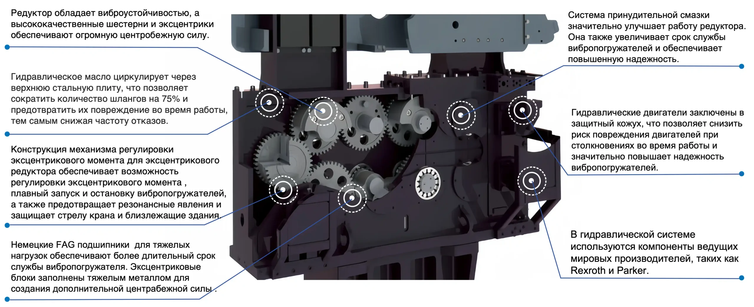 Система охлаждения большой емкости предотвращает перегрев гидравлики, обеспечивая стабильную работу даже при длительной эксплуатации вибропогружателя. Редуктор оснащен комбинированной системой смазки (разбрызгиванием и принудительной подачей), которая не только смазывает полностью компоненты во время работы, но и отводит тепло от высокоскоростного вращения, ещё по мере увеличения объема смазочного масла рост температуры корпуса замедляется.