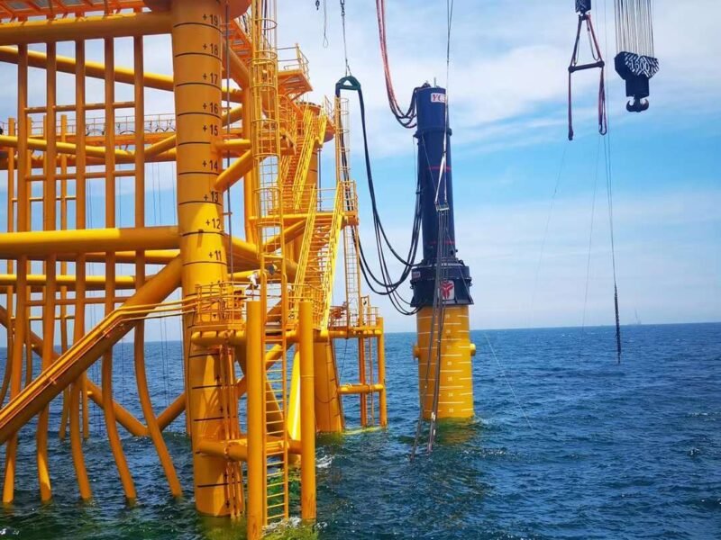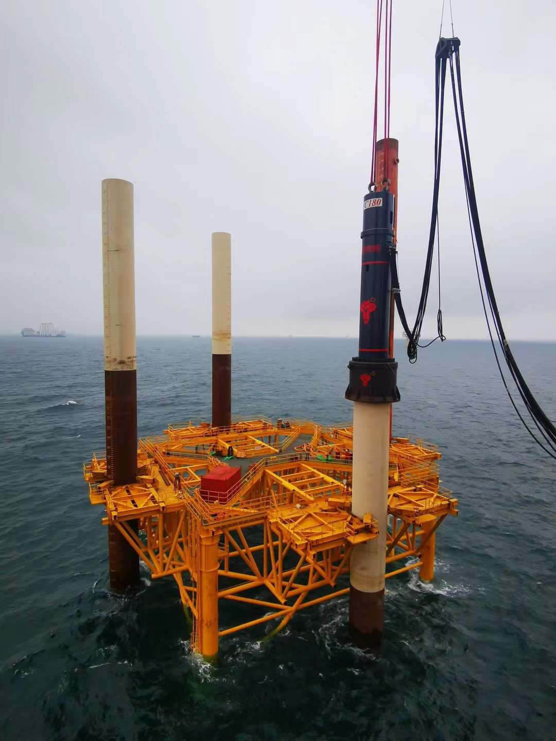 В марте мы завершили производство самого большого в мире гидравлического ударного молота одностороннего действия YC-180, и вскоре он был впервые использован на морской ветряной электростанции в районе А проекта в Чанлэ, провинция Фуцзянь. На платформе повышающей подстанции в районе А проекта, несмотря на сильный туман на море, благодаря богатому опыту, высокому профессионализму и слаженной работе проектного отдела Китайского железнодорожного мостостроительного бюро и нашего отдела послепродажного обслуживания, молот YC-180 успешно забил стальные трубы на заданную глубину и успешно дебютировал.