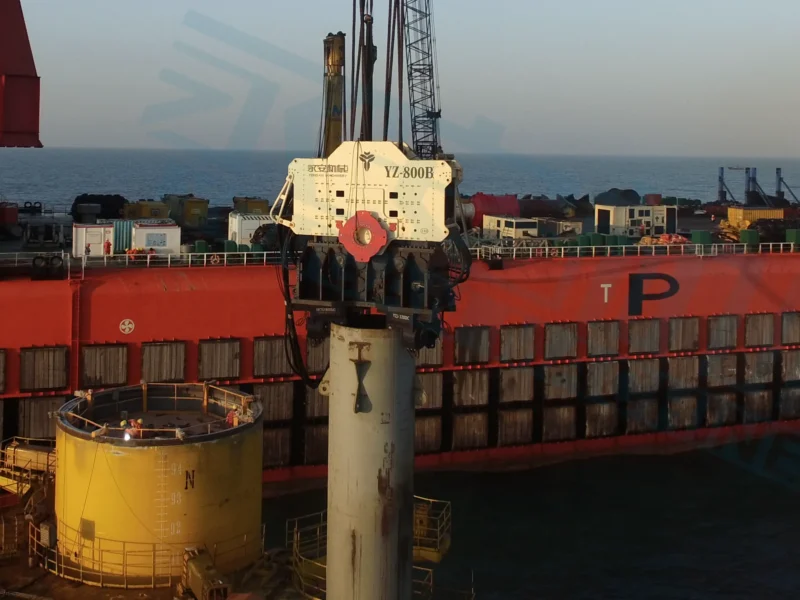 В рамках проекта был использован наш самый мощный гидравлический вибромолот YZ-800B для забивки монолитных свай длиной 86 м, диаметром 2,3 м и весом до 300 тонн. Эксцентриковый крутящий момент YZ-800B достигает 550 кгм, максимальная возбуждающая сила — до 12100 кН, а максимальная сила вытягивания — 6000 кН. Это отличное решение для забивки больших свай при строительстве мостов, морских ветроэлектростанций и других сложных фундаментных проектах.